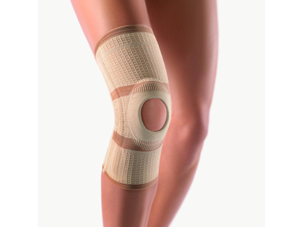 - bandáž kolene s vybráním pro patelu pro stabilizaci a odlehčení kolenního kloubu