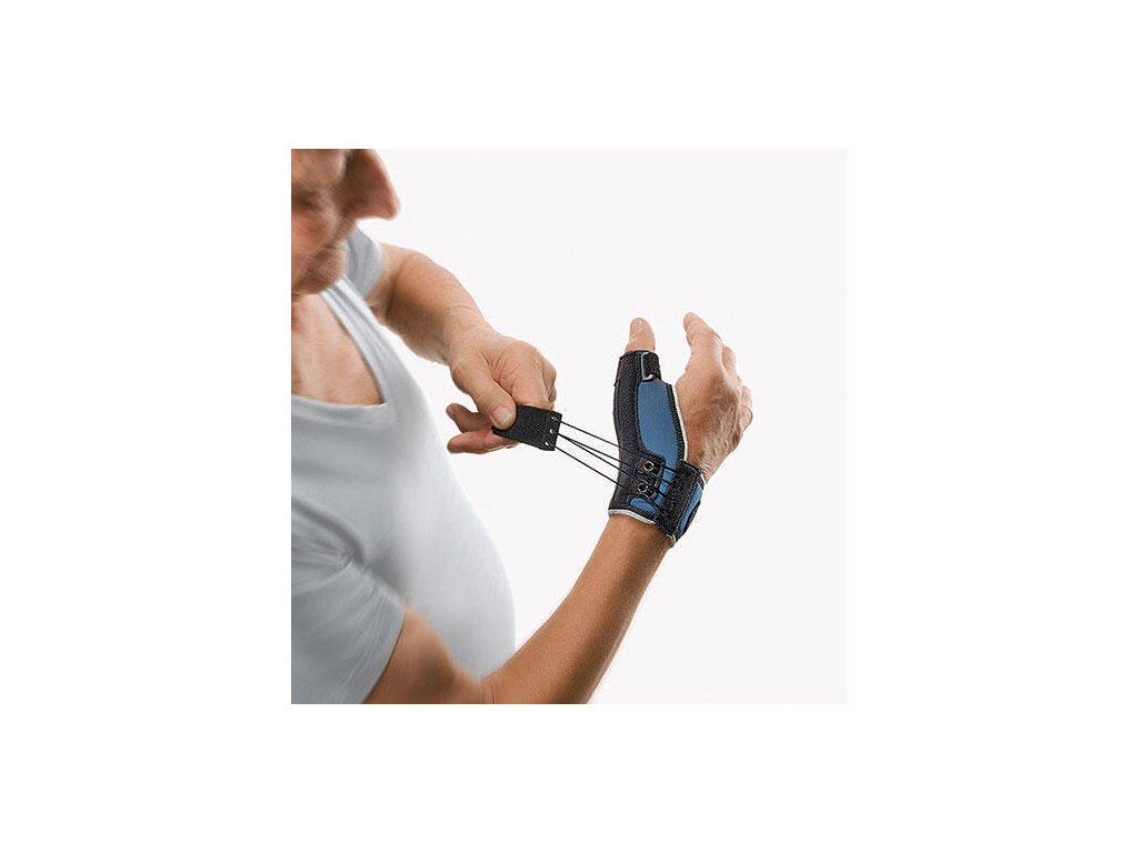 Ortéza má měkké vnitřní polstrování a je vybavena vyjímatelnými anatomicky tvarovanými dlahami, které sahají až k zápěstí. Snadné nasazení zajišťuje praktické šněrování, zatímco palcový pásek s vratnou smyčkou drží ortézu bezpečně na místě.