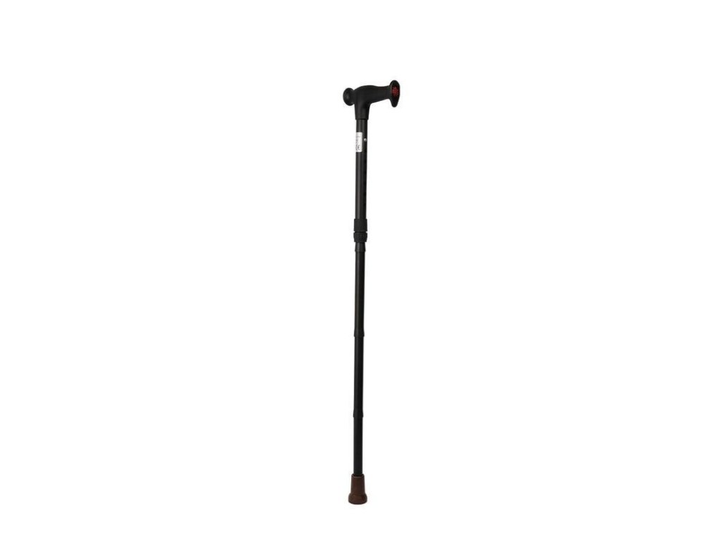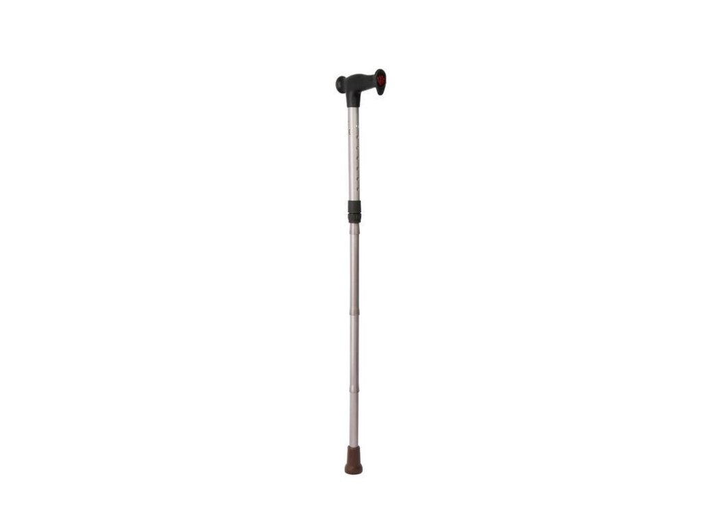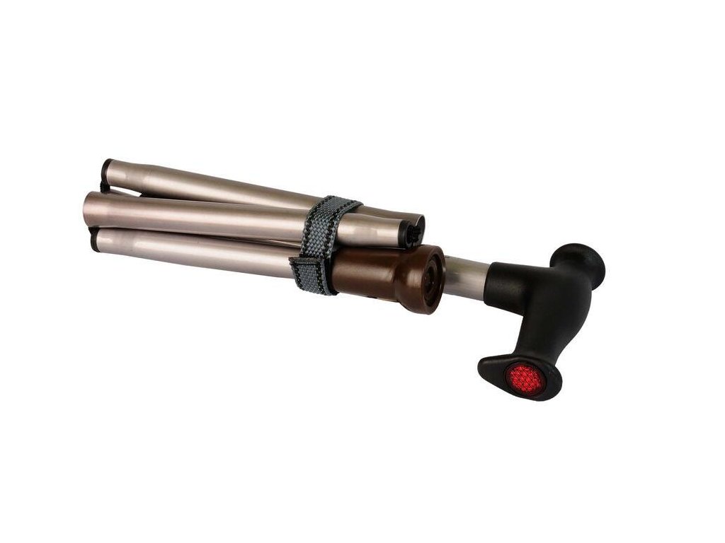 Skládací duralová hůl. Jedná se o velmi lehkou a skladnou pomůcku. Ve tvarované rukojeti jsou z obou stran odrazky. Ke každé holi se dodává pásek se suchým zipem, který slouží k zajištění hole ve složeném stavu.