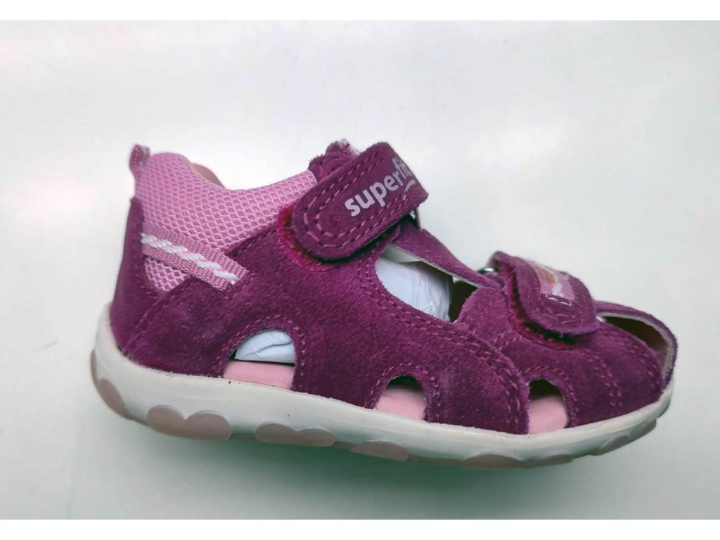 Sandálky značky Superfit s krytou špičkou a zapínáním na jeden suchý zip. Boty mají maximálně ohebnou podešev, kvalitní koženou stélku a opatek, který drží kotník dítěte ve správné poloze.