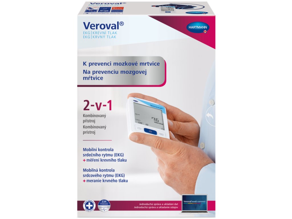 Srdeční arytmie, např. nebezpečné fibrilace síní a vysoký krevní tlak, jsou hlavními rizikovými faktory pro vznik mozkové mrtvice a infarktu. Srdeční arytmie se však obvykle vyskytují v nepravidelných intervalech, proto mohou být odhaleny pouze v době, kdy k nim dochází. S přenosným EKG od Veroval® nyní můžete zaznamenávat svůj srdeční rytmus kdekoli a kdykoli, když pocítíte příznaky. Na přístroji uvidíte své výsledky přehledně a srozumitelně. Vpřípadě potřeby si můžete výsledky EKG vytisknout nebo zaslat e-mailem svému lékaři.