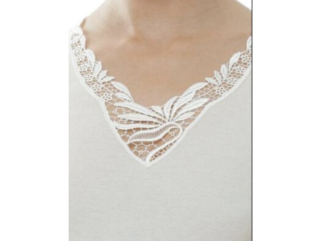Elegantní vzhled podtrhuje jemná hedvábně lesklá krajka s motivem, která dodává tričku ženský a sofistikovaný styl.